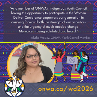 “As a member of ONWA’s Indigenous Youth Council, having the opportunity to participate in the Women Deliver Conference empowers our generation in carrying forward both the strength of our ancestors and the urgency of much-needed change. My voice is being validated and heard.” - Alysha Wesley, ONWA, Youth Council Member