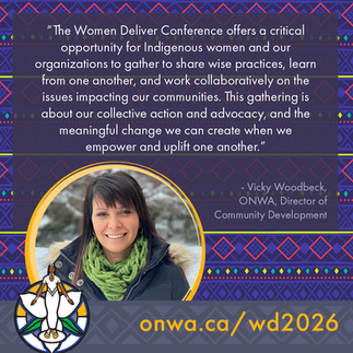 “The Women Deliver Conference offers a critical opportunity for Indigenous women and our organizations to gather to share wise practices, learn from one another, and work collaboratively on the issues impacting our communities. This gathering is about our collective action and advocacy, and the meaningful change we can create when we empower and uplift one another - build each other up” - Vicky Woodbeck, ONWA, Director of Community Development